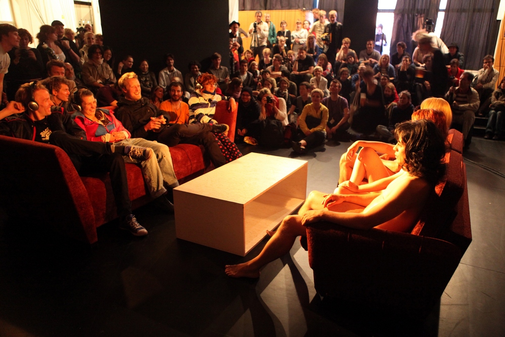 Mistermissmissmister a été créé en 2002 par Ana Borralho et João Galante. Il-Elle l’interprètent ici avec Antonia Buresi. Le dispositif est simple, dans une des alcôves du hall du CND, deux canapés qui se font face, chacun assez grand pour y tenir à trois sans se toucher. Entre les sofas, une table basse et trois casques. Les performeuses arrivent à leur sofa, dos au mur, se déshabillent rapidement et s’asseyent. En face, trois places pour trois membres du public qui restent le temps qu’ils ou elles veulent, chaussent les casques, afin que ça puisse commencer. Chacun-e des performeurs-ses se lance dans un jeu de teasing, dont on ne sait pas très bien jusqu’où il peut aller. Le trouble commence peut-être là, dans la situation elle-même – se faire chauffer par ces personnes nues au milieu du public. Ou bien il commence dans les corps eux-mêmes telles qu’on les voit, ou tel qu’ils interagissent avec nous : on ne sait vraiment plus si ce sont des corps d’homme ou de femme. Les appareils génitaux, la forme de la poitrine, du corps lui-même, sont précisément contrastés du visage, deux corps avec un vagin et des seins et pourtant des barbes bien taillées. Au milieu, il-elle a bien un pénis, mais le visage apprêté et maquillé d’une femme élégante dans la quarantaine. La musique, élément surprise du dispositif, vient aussi déranger, et peut même faire spontanément rire : de Beyoncé à … J’ai eu Leonard Cohen :