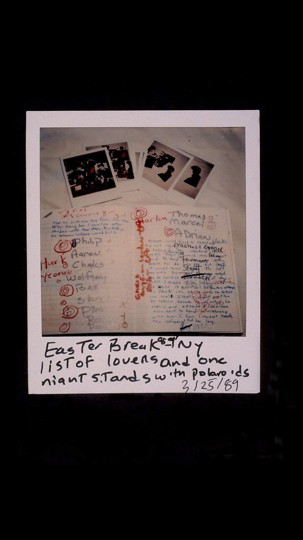On poursuit d’ailleurs la visite par une sorte d’espace intermédiaire, un couloir qui passe derrière les ascenseurs et les escaliers. Autant la salle précédente, du fait de ses murs noirs, est dans des teintes sombres éclairées par les images projetées, autant le corridor est blanc, permettant de voir les reproductions de pages du « Carnet orange », soit une archive du travail même de l’artiste. Mais l’archive, comme il se doit, recueille des affichettes de soirées et des cartes de visites de saunas ou bien de restaurants collectées lors d’un séjour à Genève en Suisse, des lettres adressées par des amis ou encore des notes de travail. L’intimité se livre selon une modalité différente dans ce couloir blanc, plus visible et paradoxalement moins exposée. Ce « Carnet orange » est, plutôt que la compilation des traits de génie du créateur isolé, un recueil de traces diverses de la vie même de qui accomplit l’œuvre, dans ces aspects jusque – ou avant tout – les plus élémentaires, les plus triviaux : la baise, la mort et la perte. La bouffe aussi.