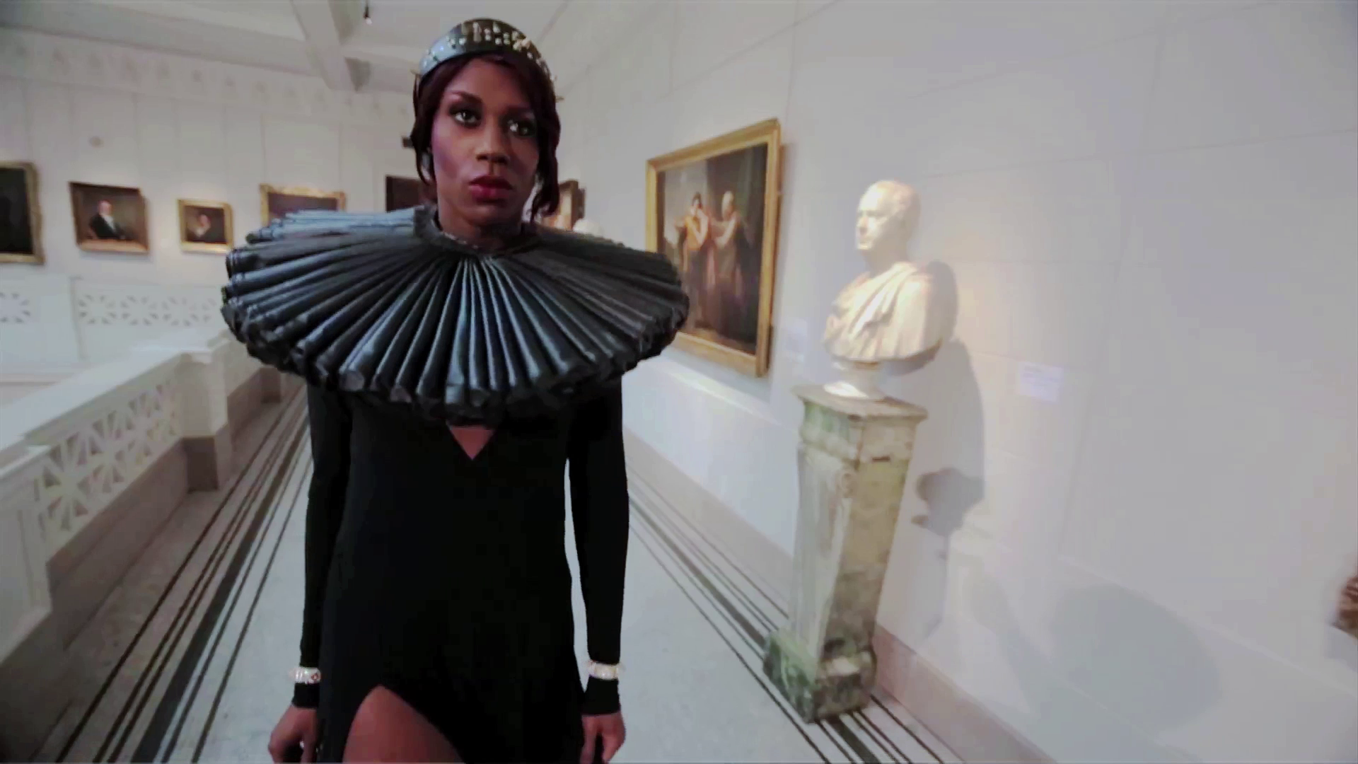 FIVE expose le voguing comme une danse dont les poses veulent dire plus que ce qu’on voit de premier abord. Il parvient à faire sentir des séquences problématiques d’histoire derrière elles. La 3D dans Icon ou les spots publicitaires de King of Arms, nouvel âge de la reproductibilité technique de l’œuvre d’art, nous fait voir et sentir ce qui arrive à ces symboles une fois réappropriés et placés dans d’autres circulations. De tels symboles sont d’ailleurs bien exposés dans leur condition de biens marchands, de la fashion industry au stuc qui entoure les tableaux des salons du musée des Beaux arts de San Fransisco, et leur confère une valeur d’exposition. La 3D saute par dessus la valeur d’échange et une certaine projection de l’authenticité, comme on peut reproduire un tel ornement et un tel luxe pour l’outfit qu’on prépare pour un ball de voguing. Ce qui est mis au travail ici, c’est comment des jeunes afro-américains trouvent des moyens d’exister dans le capitalisme globalisé, au milieu des images qu’il véhiculeiv. Voilà pourquoi Rashaad travaille avec la scène voguing, et voilà pourquoi le type de travail qui la rétribue comme il se doit : en travaillant avec elle à produire les images et les discours qui lui permettent de comprendre ce qu’elle est en train de faire, ce que ses membres sont en train de découvrir.